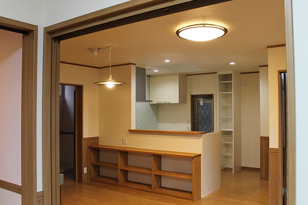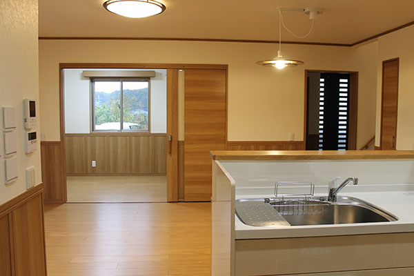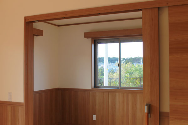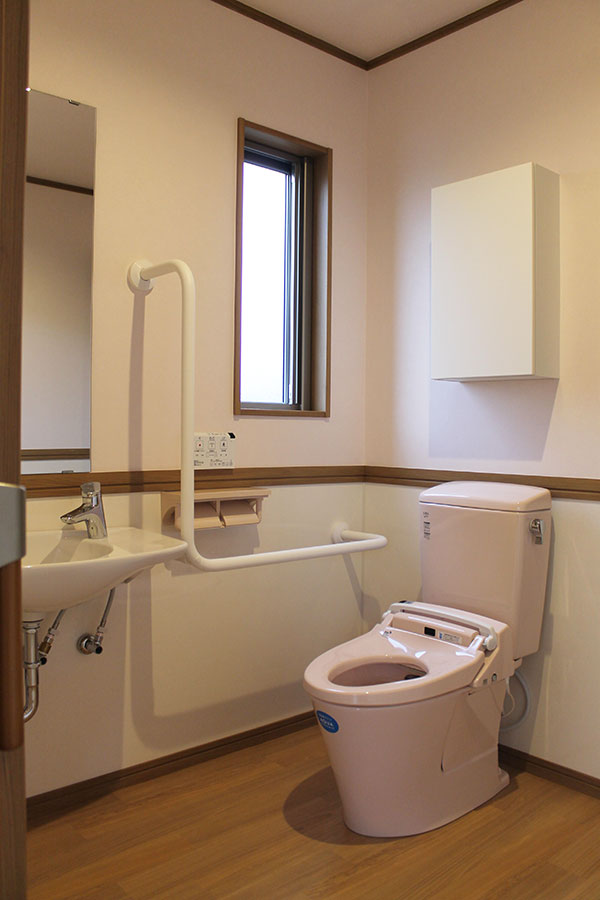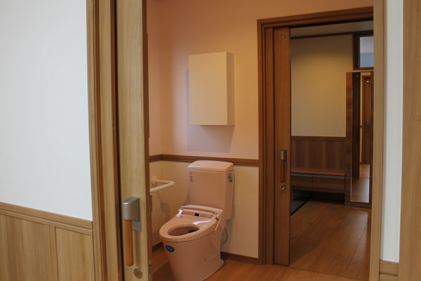 - 1階は玄関から室内まで全て床はフラット、部屋間の扉は奥様の部屋以外は全て引戸にし、車いすで楽に移動できるようにしました。トイレは、車いすが十分に回転できる十分なスペースを確保しました。
