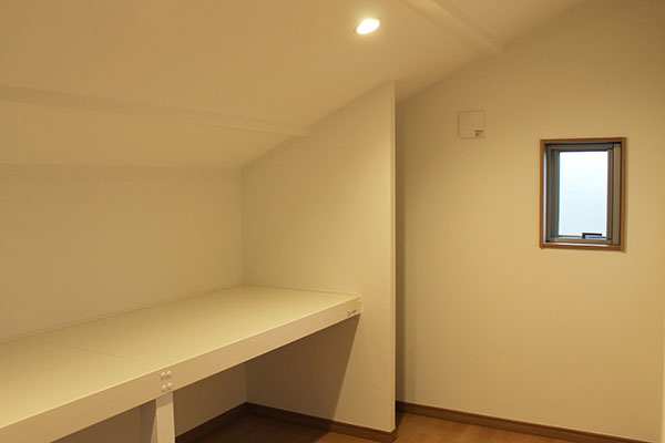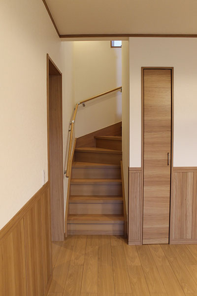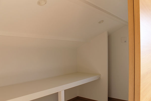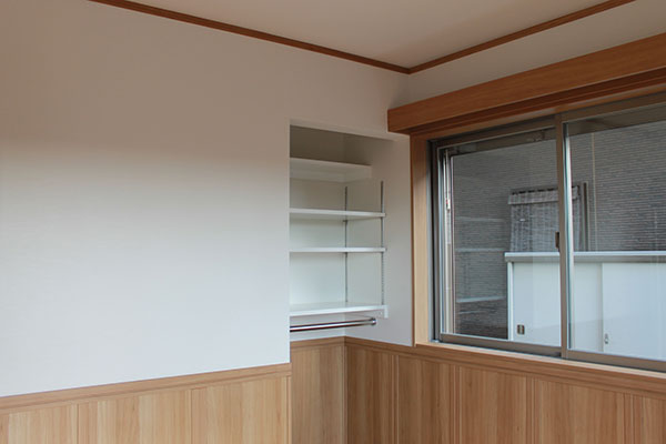 - 面積の制約がある中、車いすで楽に移動できるスペースを確保する事を優先しました。日常使うものの収納を1階に確保し、使用頻度の少ない物は、2階に設けたウォークインクロゼットや納戸に全て納めるようにしました。