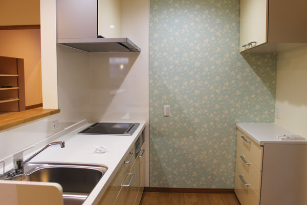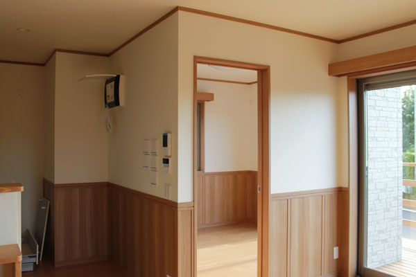 - 1階の壁は全て、車いすがぶつかっても傷がつきにくいように木製の腰壁を廻しました。転倒の際の衝撃を緩和するために、フローリングは衝撃吸収タイプ、水廻りの床の塩ビシートもクッション性の高い商品を採用しました。