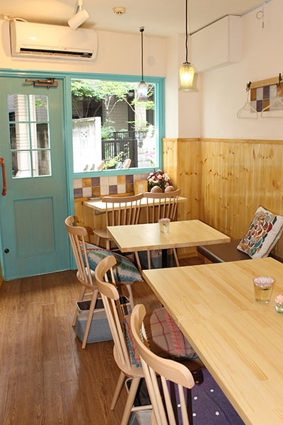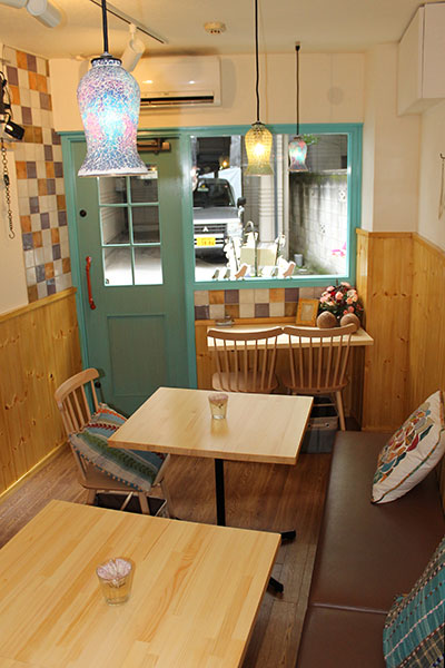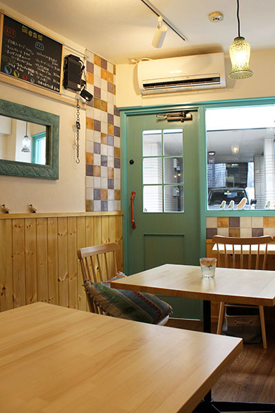 - オーナー夫妻が、プロバンス風のナチュラルなイメージを嗜好していたここもあり、パイン柄の腰壁を廻し、上部は白の珪藻土の塗壁で、湿度調整機能と消臭機能を持たせました。個性的な色の組み合わせのタイルをアクセントにし、エスニックな雰囲気を添えることができました。